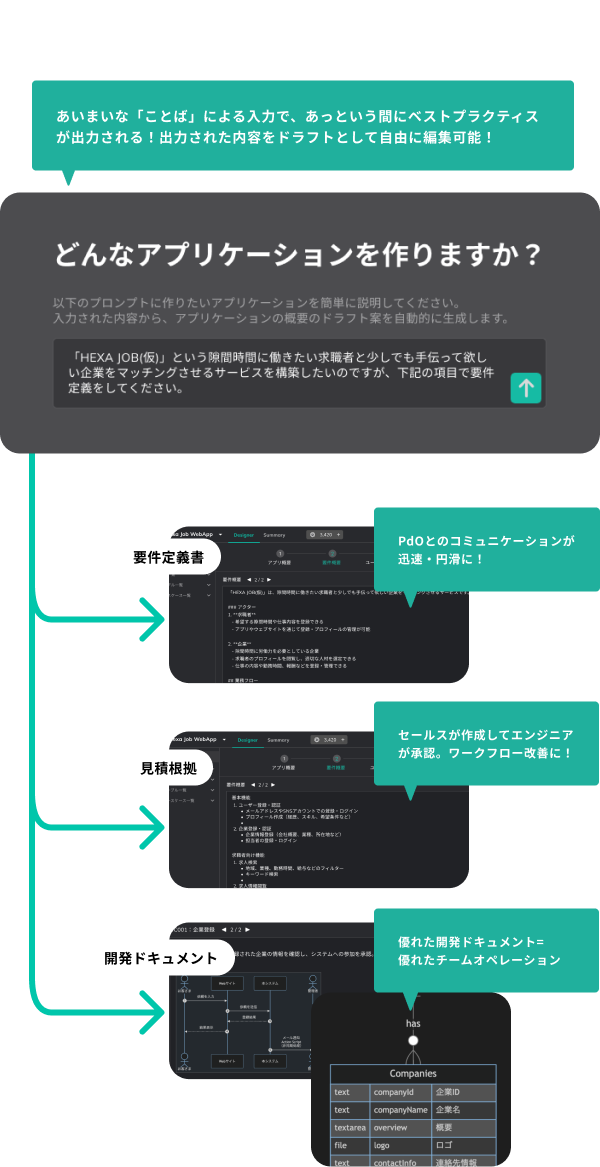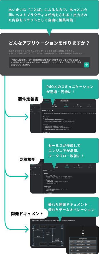 来る日も来る日も要件定義と見積作成に追われている・・・そんなエンジニア、Slerの方々へ真っ先に試して頂きたい待望のサービスです。これらを利用することで、時間、人員を費やさざるを得ない状況に一石を投じ、劇的な工数短縮で目指すプロダクトを磨くことに、より一層集中できるようになります。